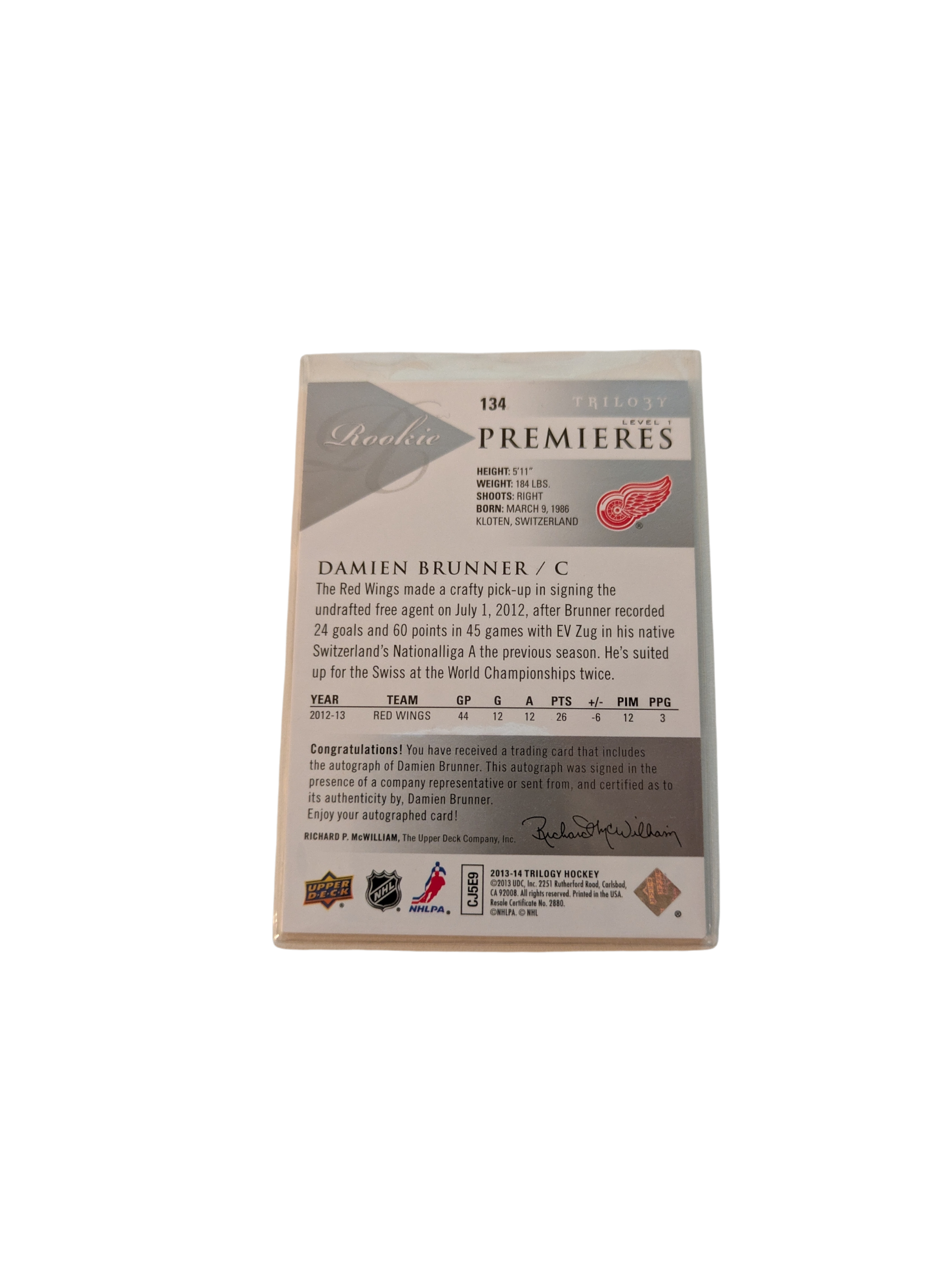 2013 Upper Deck Rookie Premieres Detroit Red Wings Damien Brunner /699 Auto card