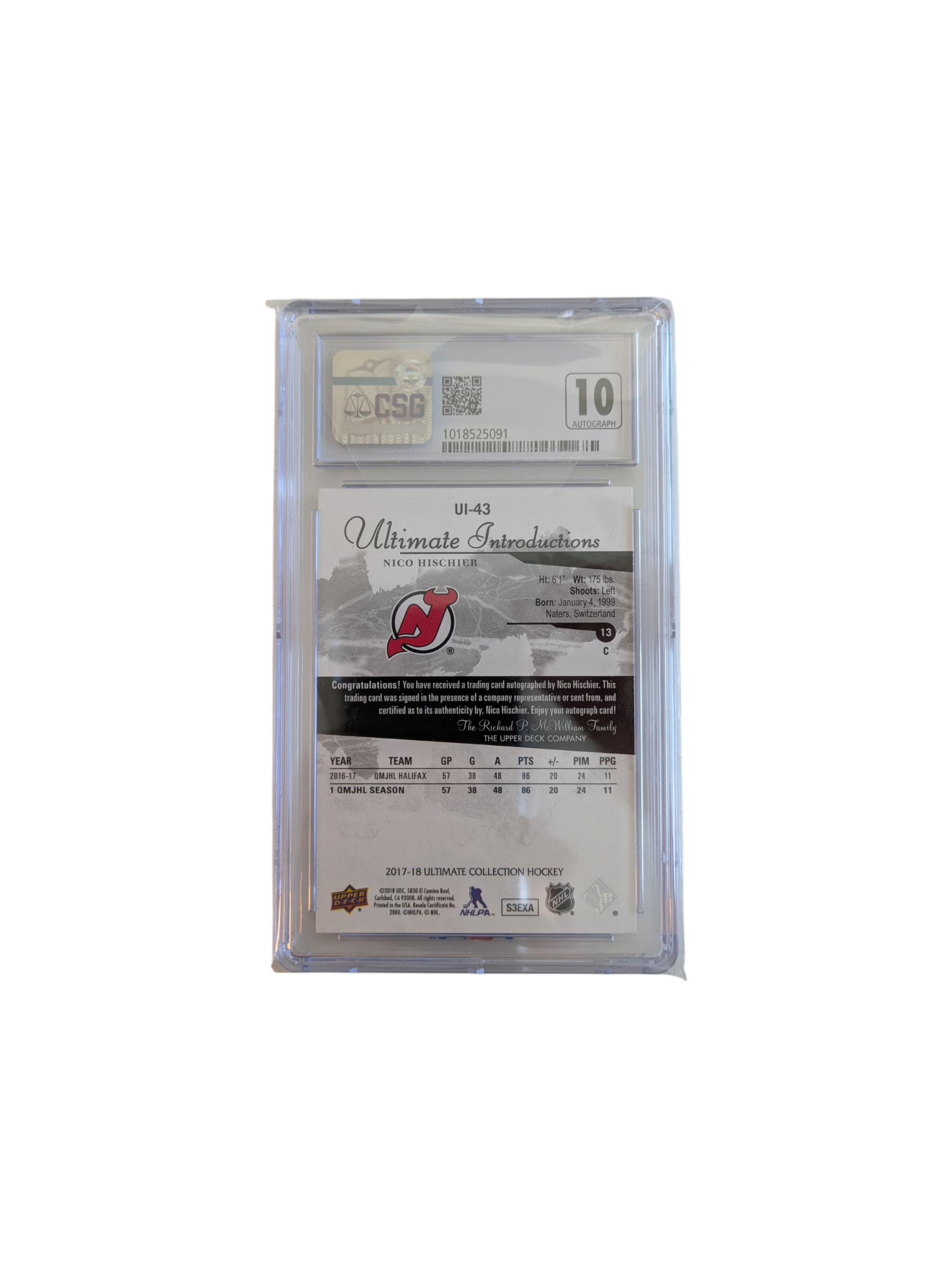 2017 Upper Deck Ultimate Collection Nico Hischier Gold Spectrum CSG Auto Card