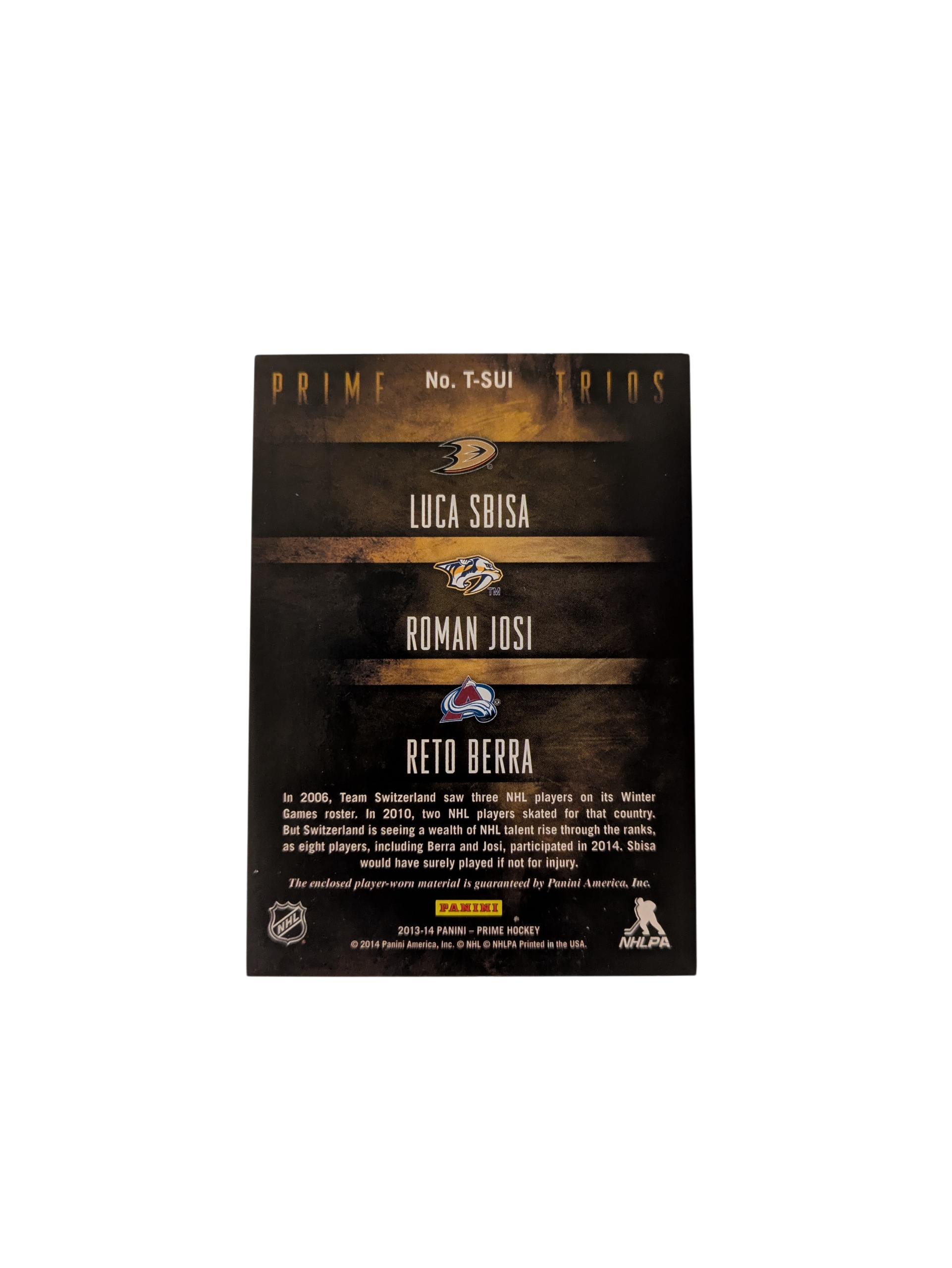 2013 Panini Prime Swiss Trios Ducks Sbisa Predators Josi & Avalanche Berra /100 Card