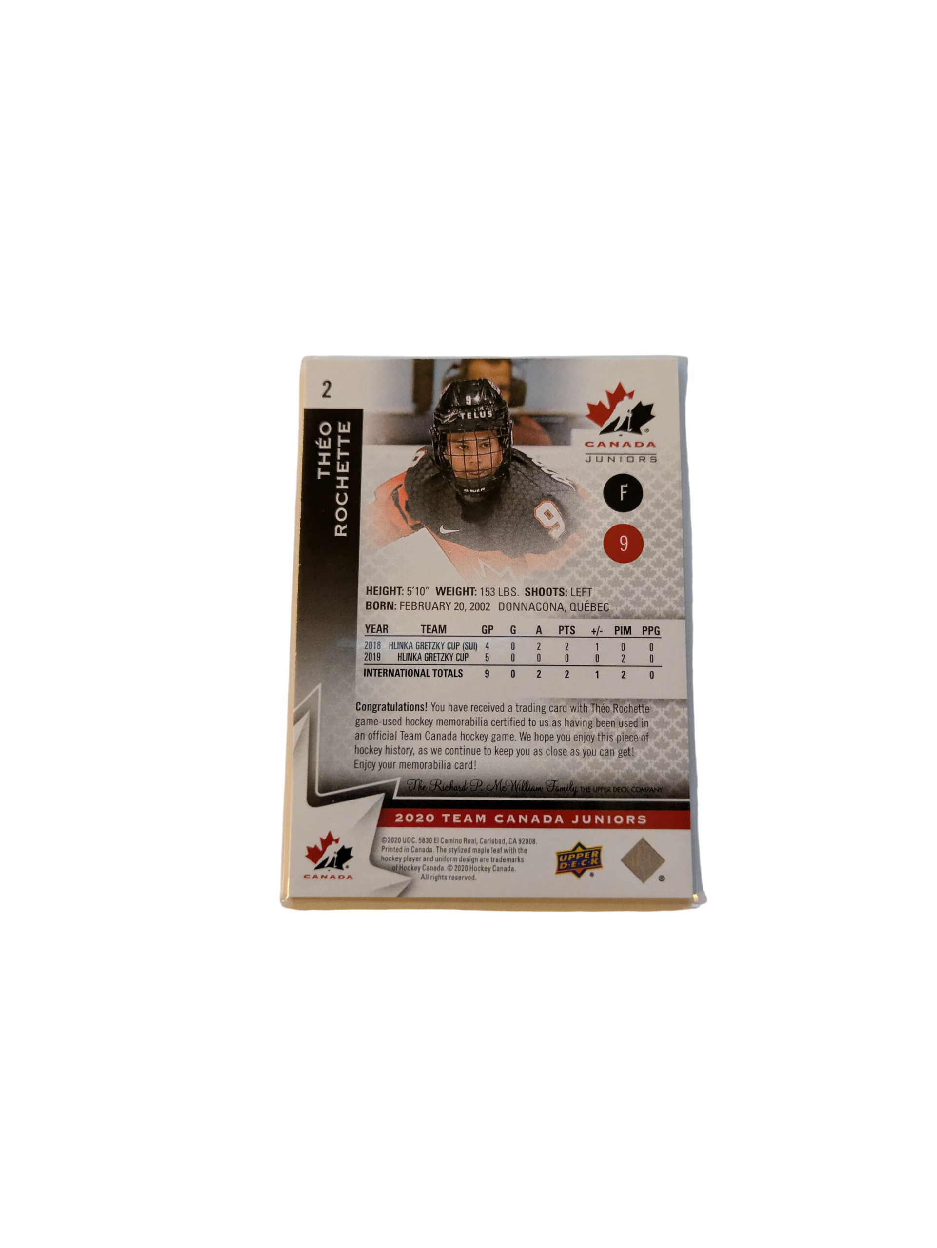 2020 Upper Deck Team Canada Juniors Theo Rochette White Jersey cover Patch card